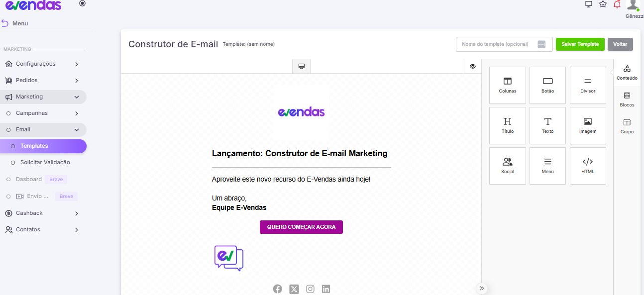 Pronto! Agora você pode criar o seu template e enviar campanhas de e-mail marketing para a sua base de clientes no E-Vendas ou via planilha Excel.