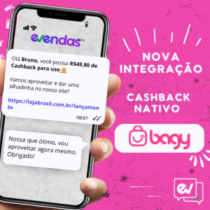 Agora o E-Vendas integra com a funcionalidade de cashback nativo da Bagy e você pode começar a notificar os seus clientes que possuem cashback para comprarem novamente na sua loja e vender mais!