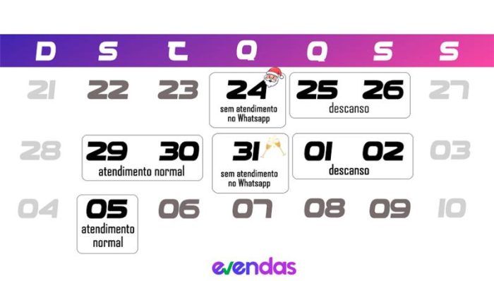 Prezado cliente, segue nosso horário de funcionamento de final de ano.
